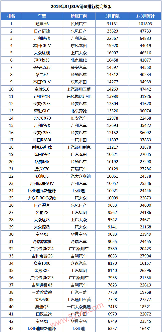 2019年3月SUV销量排行榜