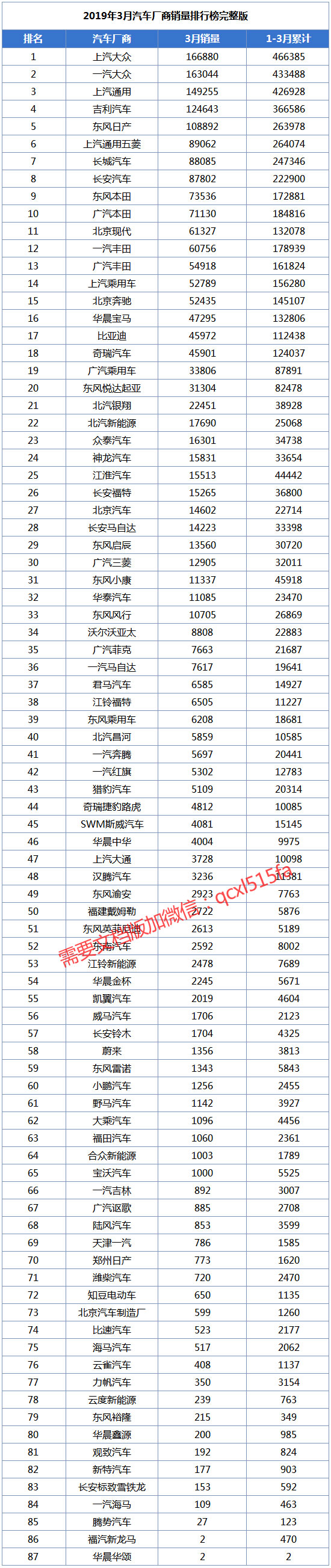 2019年3月汽车厂商销量排行榜出炉了,上汽大众以166880辆的销量成绩,夺得本月销量冠军,一汽大众以微弱的劣势,排名第二。吉利汽车销量同样出色,达到124643辆,高居排行榜第四名,成为自主品牌中唯一销量破10万辆的厂商。具体排名如下: